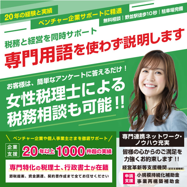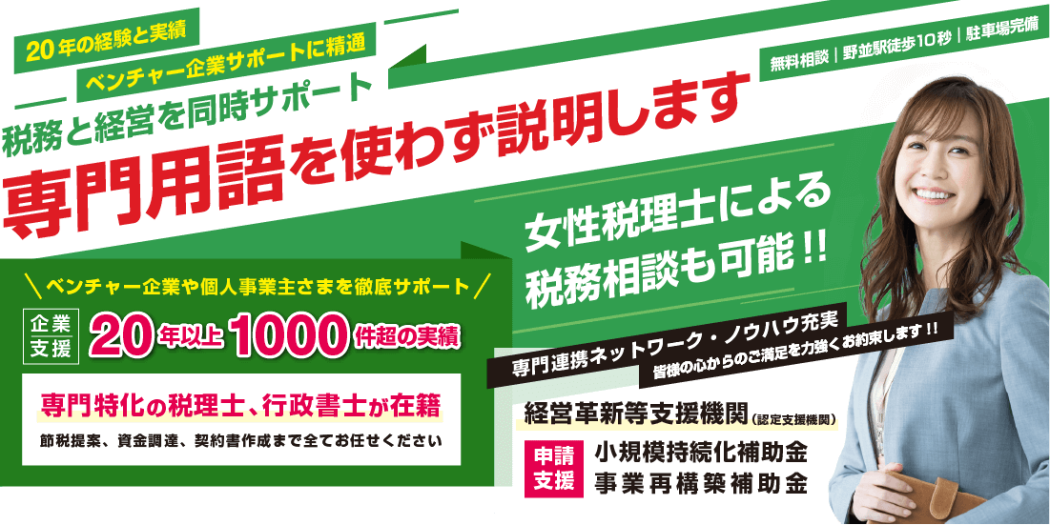 ベンチャー企業サポートに精通しこれまでの実績はのべ1,000件を超えて、税務相談、会社設立、許認可、資金調達、助成金受給などのベンチャー支援を行ってきました。これまでの経験からお客様の事情に合わせたアドバイスを行います。対象は個人事業主、法人、サラリーマン・年金生活者などの確定申告対象者です。
