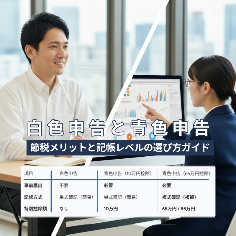 個人事業を始めるとまず悩むのが、白色申告と青色申告のどちらにするかという点です。特に青色申告には「10万円控除」と「65万円控除」があり、それぞれ必要な帳簿や節税効果が大きく異なります。